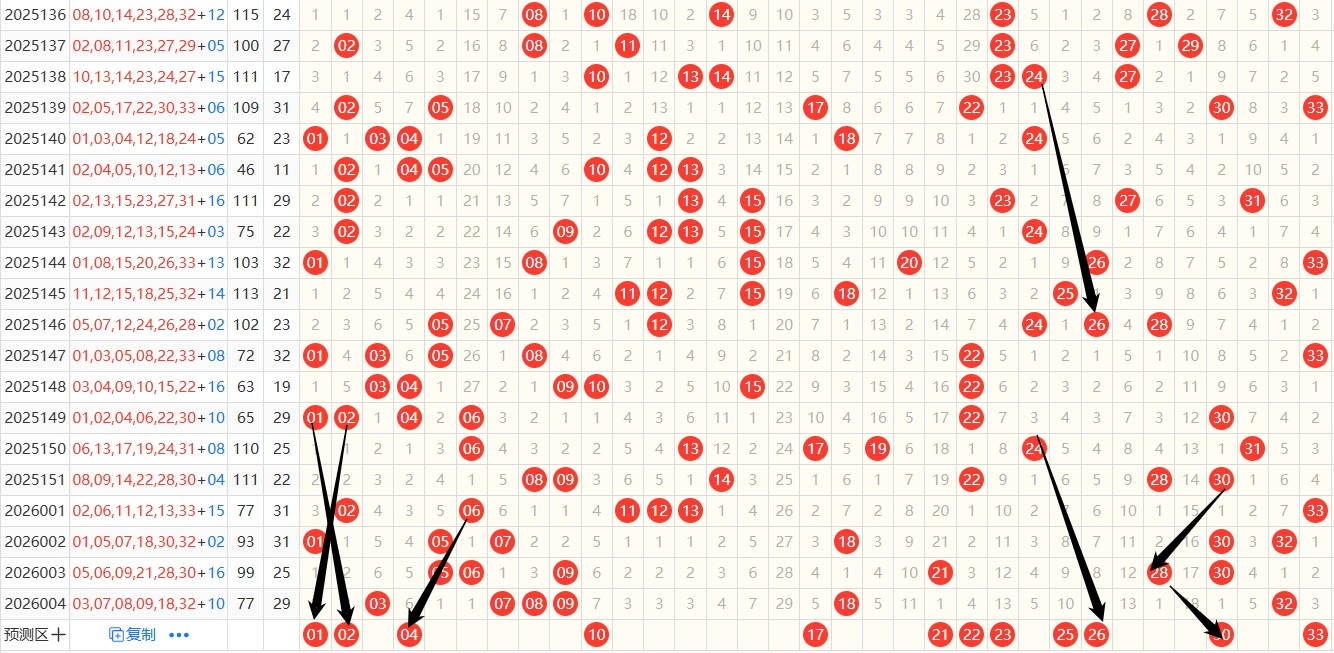 回顾上期26004期开奖03 07 08 09 18 32+ 10 ,其中一小区01-11出4个,二小区12-22出1个号,三小区23-33出1个!