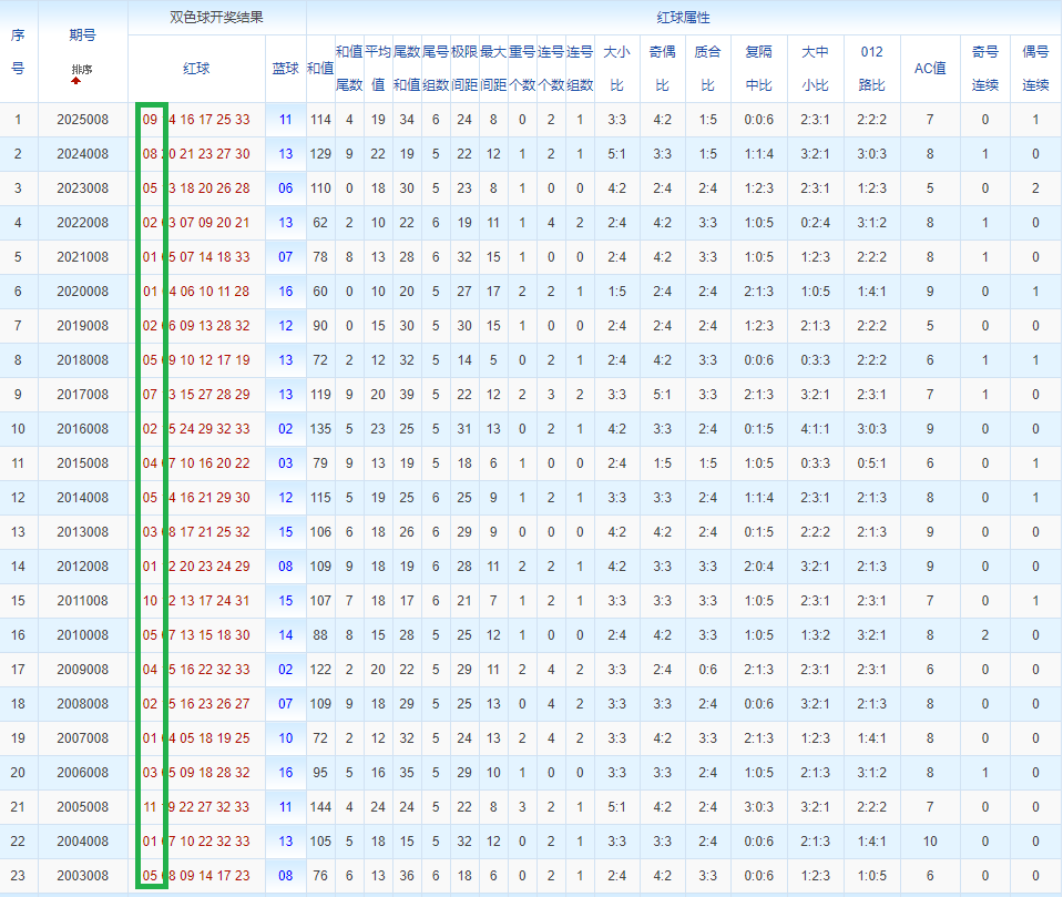 往年同期中选取出现次数靠前的数作为我们的分析对象,其数据有:05 32 33 09 07等