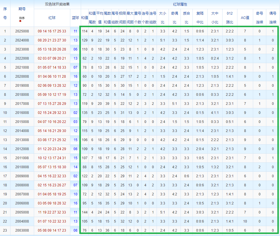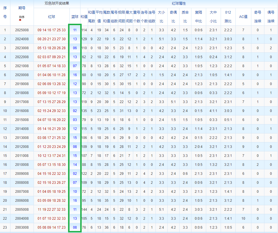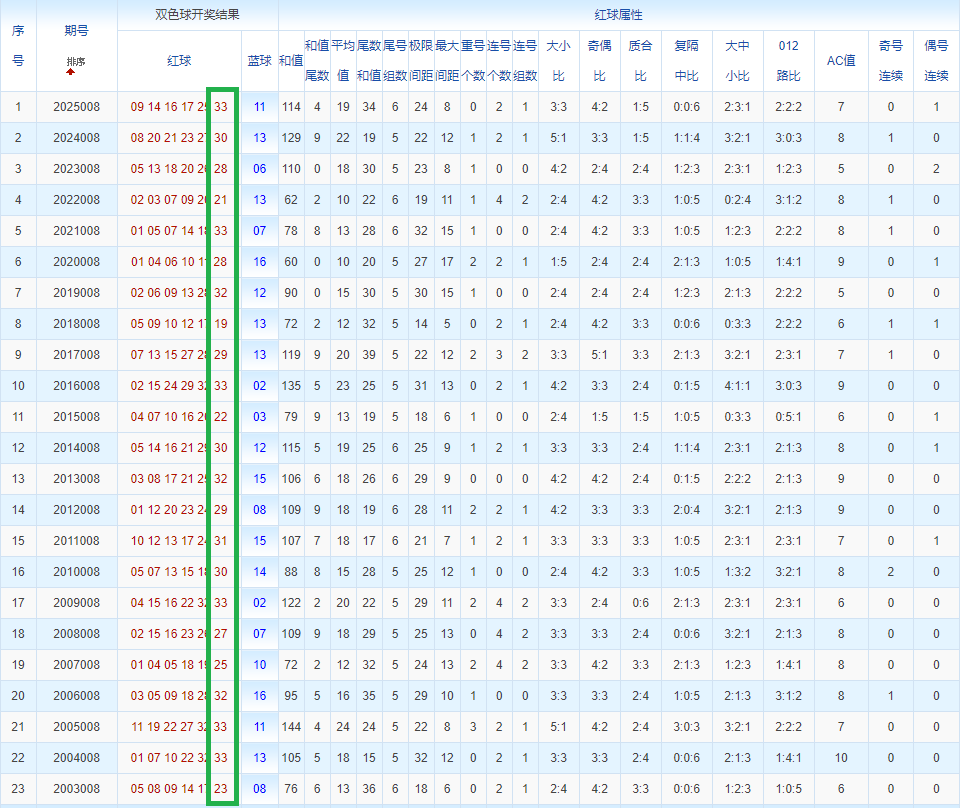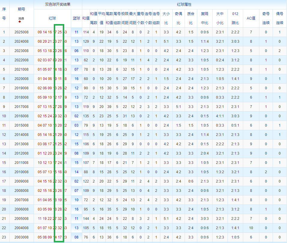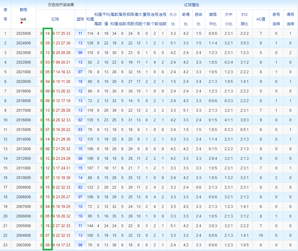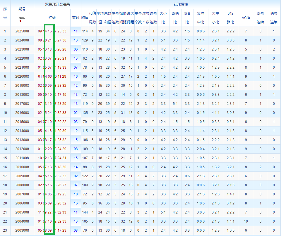 通过观察,我发现双色球往年同期的开奖数据与本期号码之间存在显著关联。具体来说,在红球中,从第一位至第六位,通常会有约4个位置上的数字与往年同期相同位置的号码一致;而蓝球号码中,也有多期开奖结果直接包含了往年同期的数字。因此,我们可以借助往年同期各位置上的号码,作为分析本期开奖情况的重要依据。在此基础上,还可结合往年同期的其他相关条件,进行综合性的号码组合推荐。
