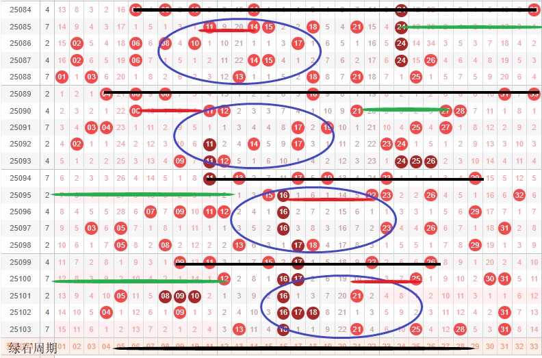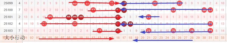 如图所示:体现的是3个局部走势的发展周期,圆圈为密集处的填空,本期定性为新局部走势1期,画线期,造成号码密集,主动调整空间,号码应密集在大号,大号本期多开,而本期为右推走势,上期没有交换首尾,本期宜不交换首尾,21 25 28三枚号码空间移动即可。本期出号继续在上期点位附近。