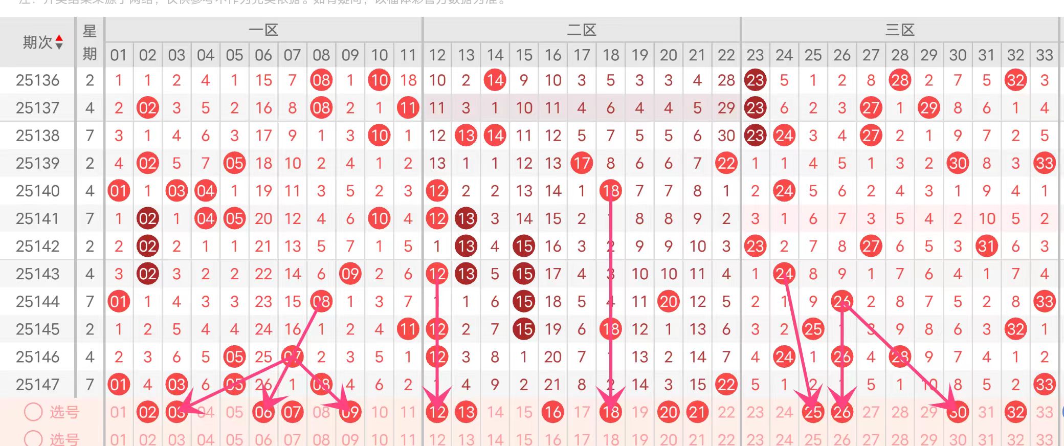 红球三区比:本期红球三区比为 4:1:1,近五期红球区间比分别为 2:3:1 ,2:2:2 ,1:3:2,2:1:3,4:1:1 本期预计红球三区比为 2:2:2。