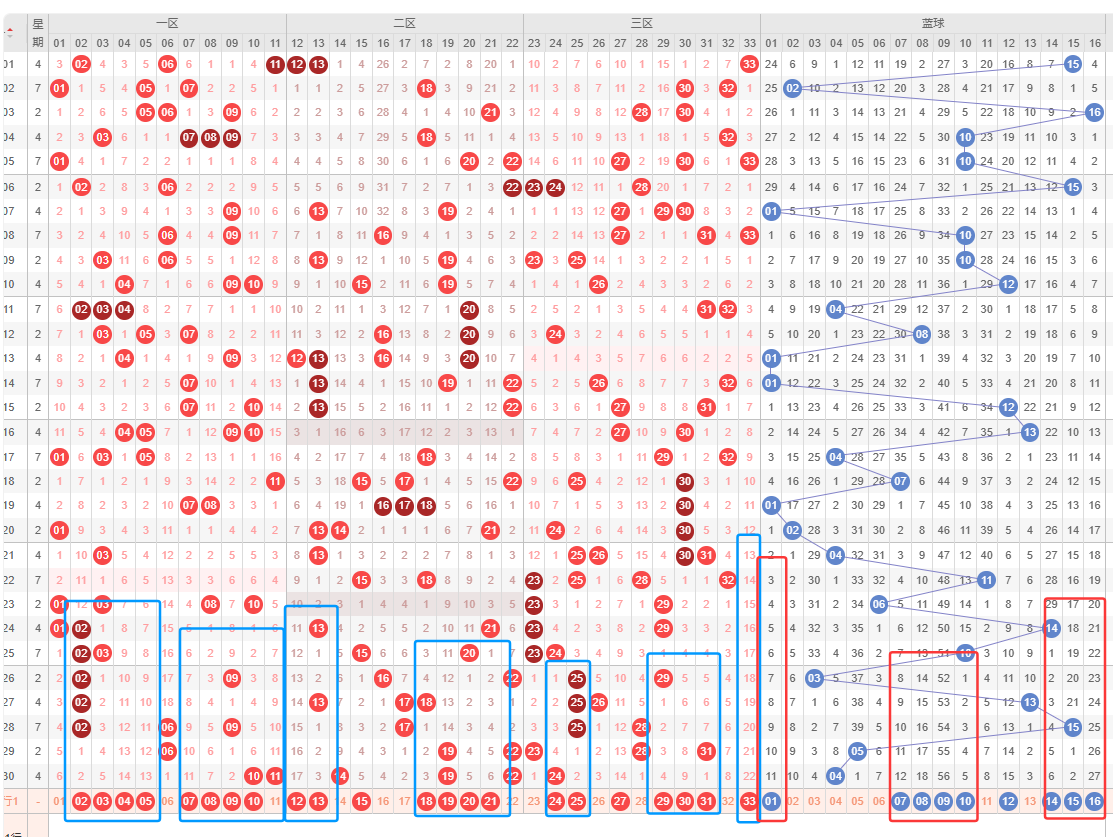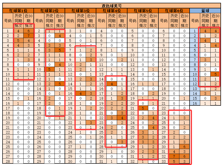6位,基本在24-33之间,历史同期频次最多的3230期,频次最多的为30-32,明显特征是合数优势;推荐重28-29-30-31-32-33