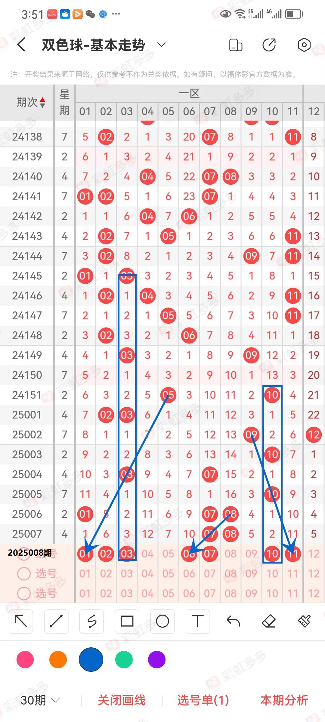 根据上一期一区开出的07.08没有隔期号和座号 本期首先关注座号07隔期号01 再分析斜连线号 06.11接下来是对称版的号03.10 至于06属于防守号 本期一区重点关注01.03.07.10.11