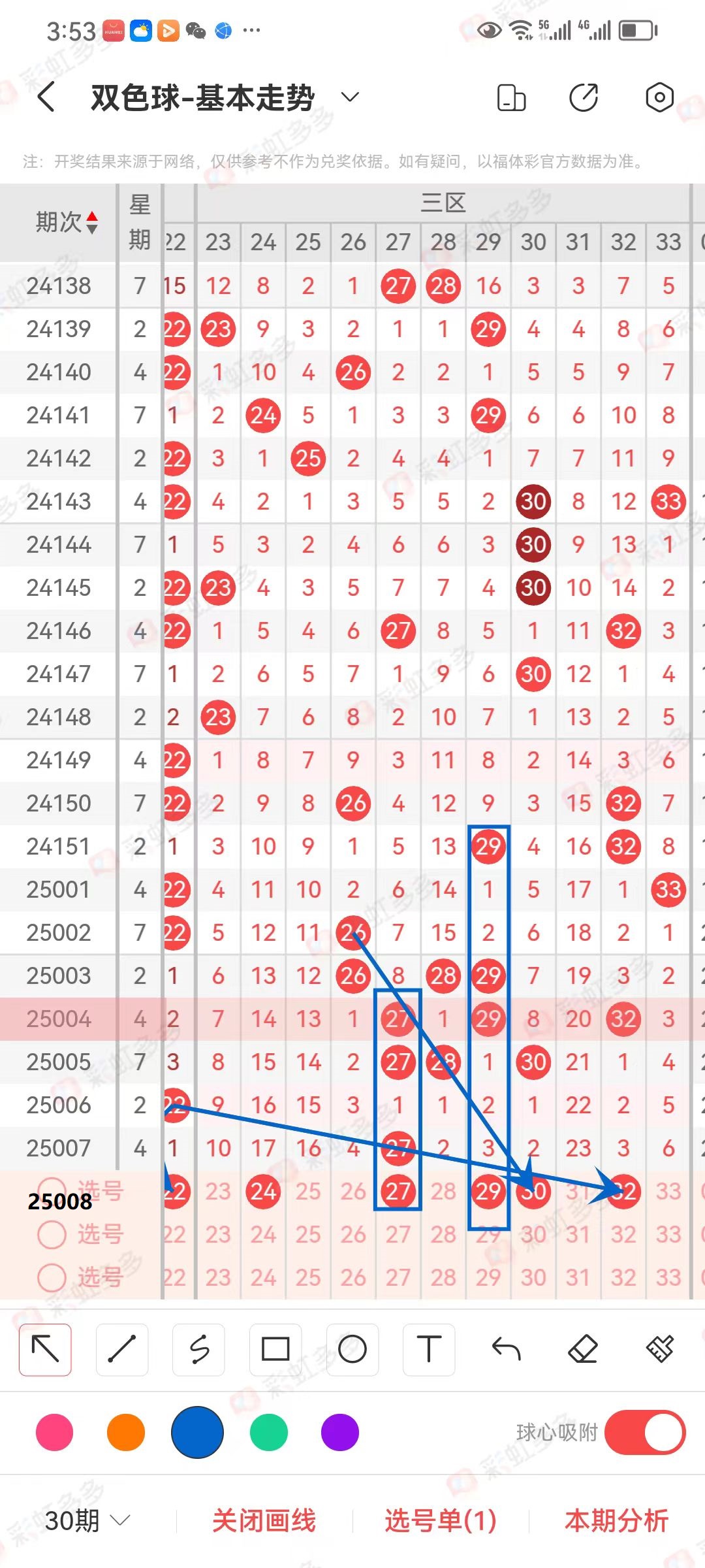 根据上一期二区开出的27没有座号 本期首先关注坐号27 再分析斜连线号 30.32接下来是对称版的号29 至于24属于防守号 本期一区重点关注30.32