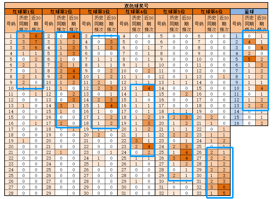 第6位,基本在24-33之间,历史同期频次最多的32;近30期,频次最多的为32,明显特征是合数优势;推荐重28-29-30-31-32-33。