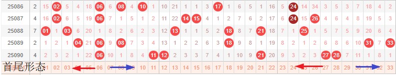 如图所示:首尾制约平衡组范围依次为:拉拉推,推缩? 本期形态范围优先选择红色左推。由于上期3枚一组形成2组连号,是利用连号组形成形态,还是连号加重号形成空间变动即为走势正反。优先选择红色左推首尾,次看蓝色右推首尾,即本期应选连号组或者重号走势。