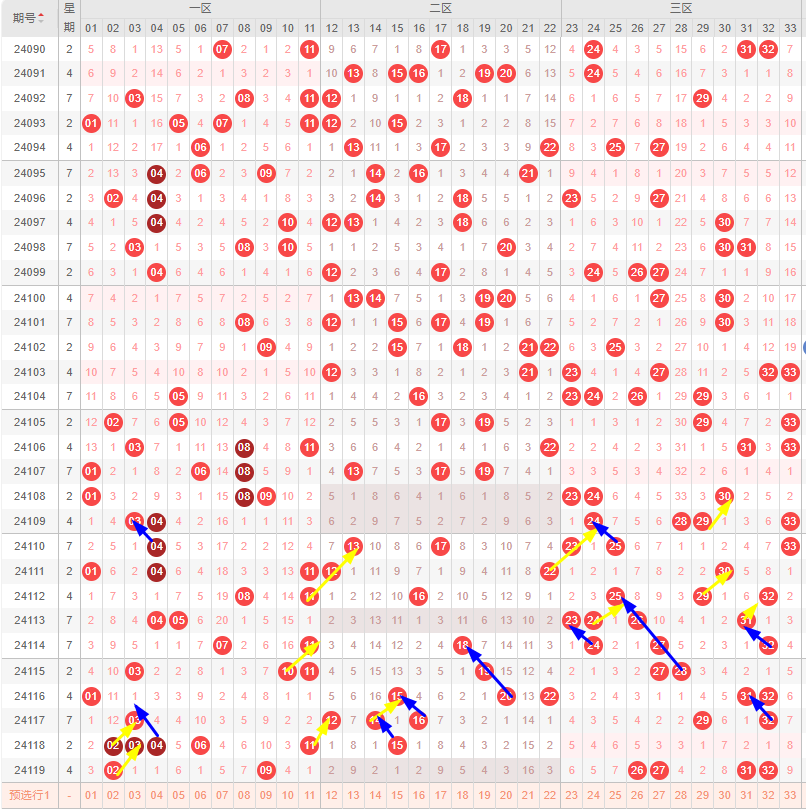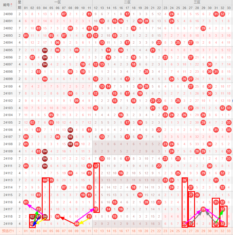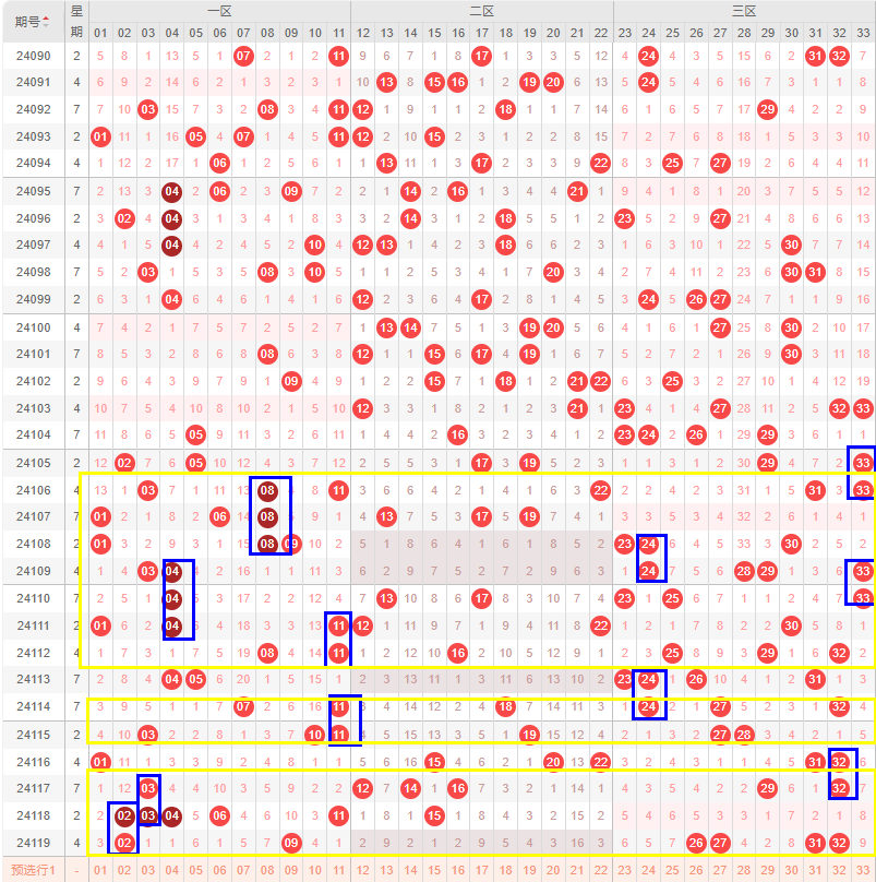 看上图蓝框最近的重号有个规律喜欢一个尾数的重号隔一次再出,现在重号断期规律在变化阶段这期不好判断重号出不出来,只能防了。根据冷热趋势判断上期重号2是重的冷号近期重号冷号也就走一期,所以这期的重号应该是重热号,近期的相同尾数下期重号的规律在24118期已经打破了,这期2和32重号的可能性不大了,要是重多个号码还是能要的,所以这期重号应该在26..27.31中产生,6.7尾上面几期没出现现过重号,这期如果要重号的话31应该当做重点。