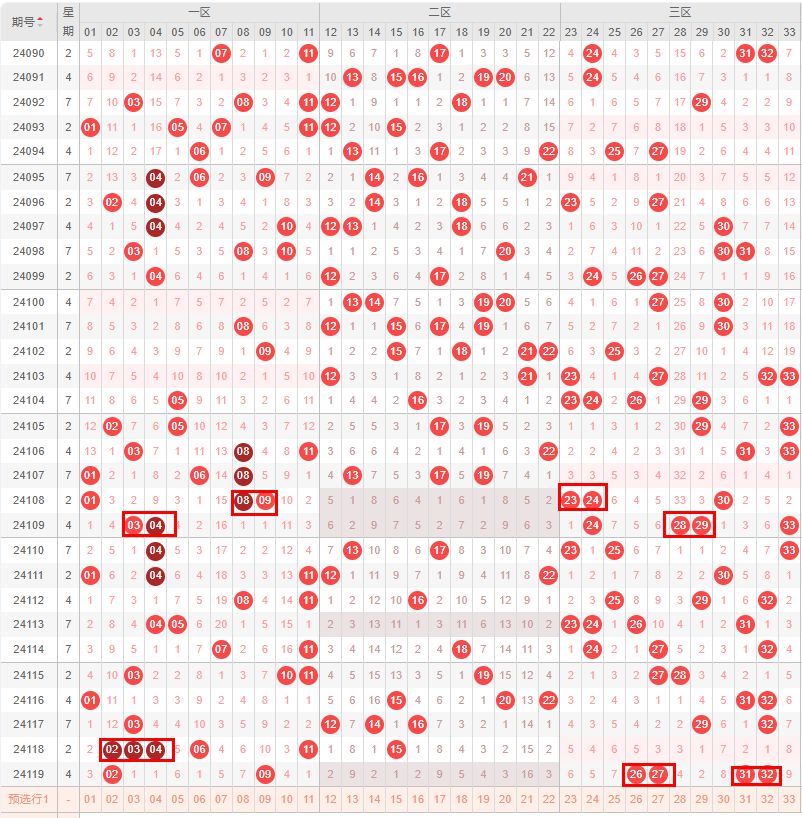 看上图可以看出上期隔期号码(红框)下期容易出相邻的隔期号码,上期出的隔期号码是:隔5.3.2.1.0的号码,就没有隔4期的号码,看近期隔5期的号码也容易出隔4期的号码,所以这期重点关注隔4期的号码:7.18.24。上期边号出现1个,这期边号也可能出现多个。与上期差3期的号码出现一个这期也会出现多个这种号码。