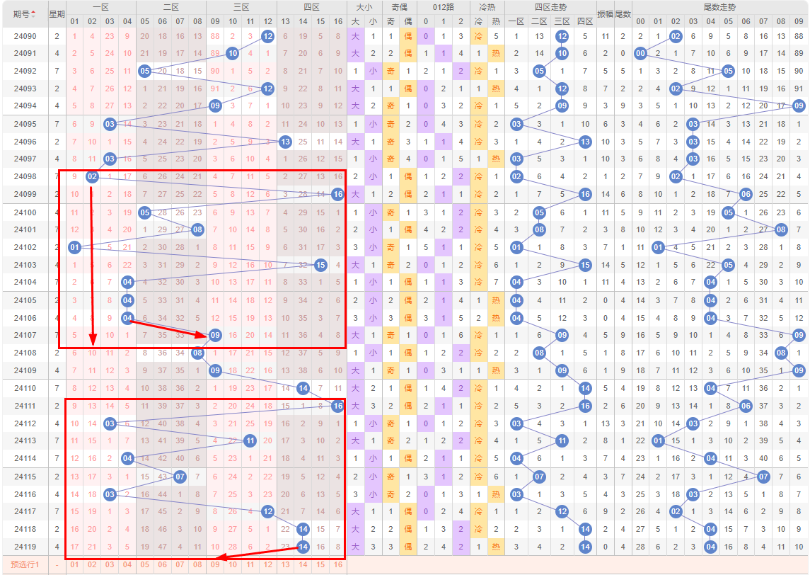 看上图,看上期重14的走势这个走势跟上边的走势走还是没变,这期应该还是会学上边的那个走势相似,这期这个14应该是和24106期那个重4一个走势,24107期出了一个9 ,这期的蓝球号码也会在9附近出号。