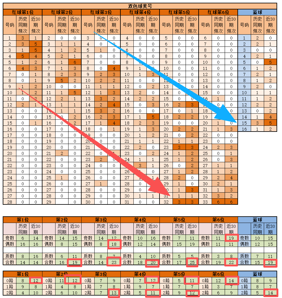 蓝球,历史同期频次最多的为15;近30期,频次最多的为5-15,明显特征是合数2路优势;推荐重点5-14-15。