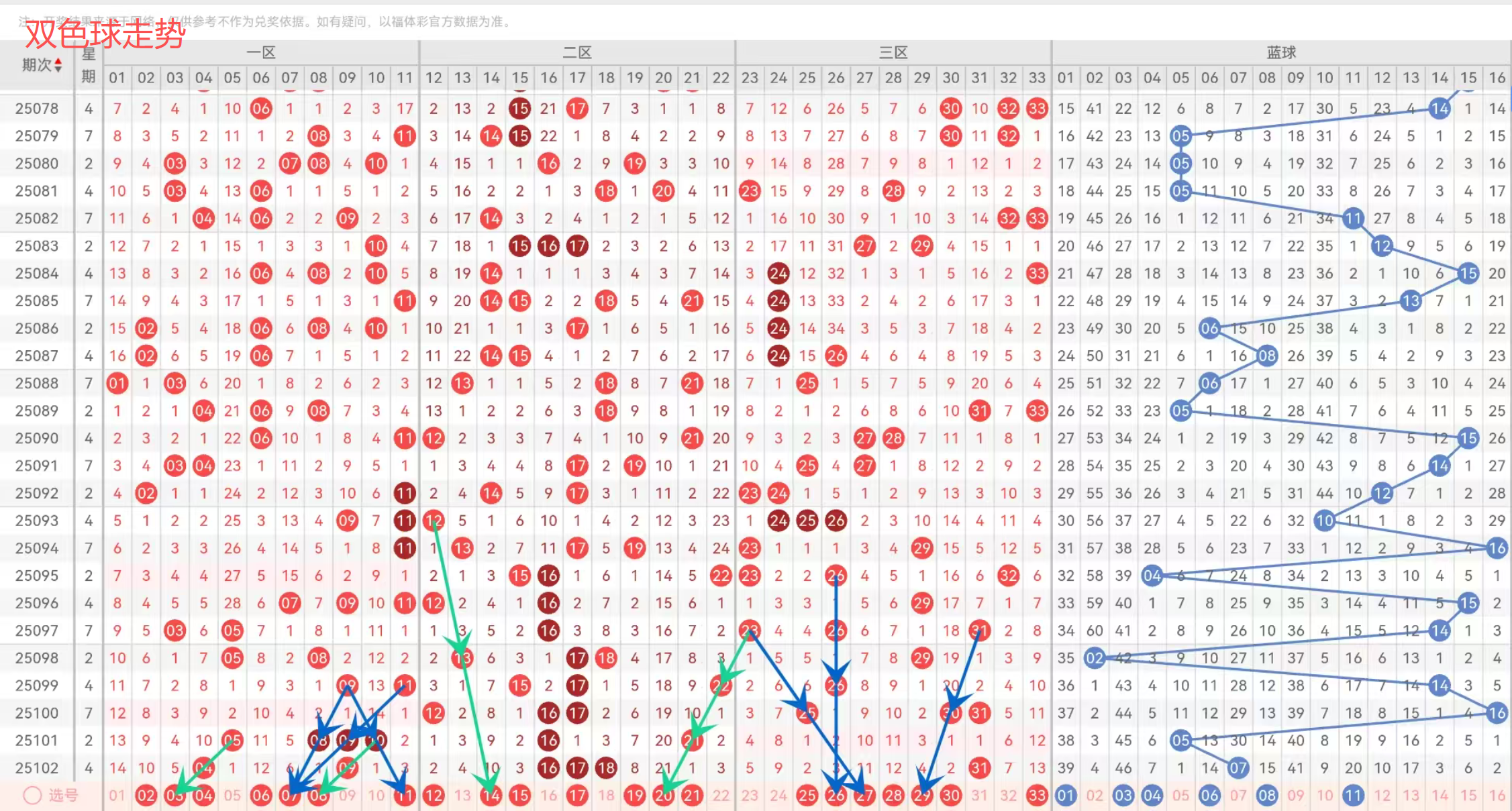 红球三区,上期有重新出1码,本期还是考虑表现比较中规中矩吧,1-2码这样;首先,走势规律比较不错的号码有26-27-29;本期比较看好中路的号码;另外,历史同期和最近33都是最热门的选择,感觉可以重点防守一下;