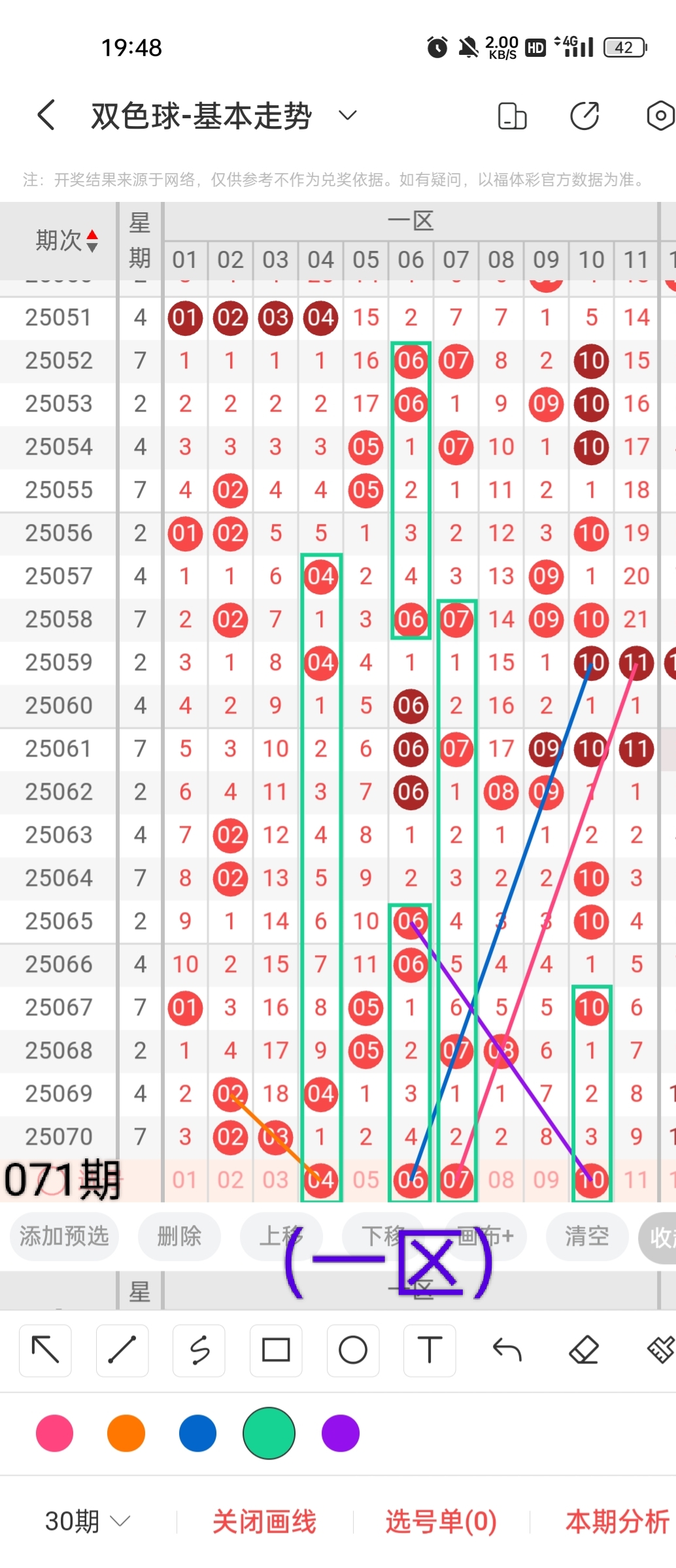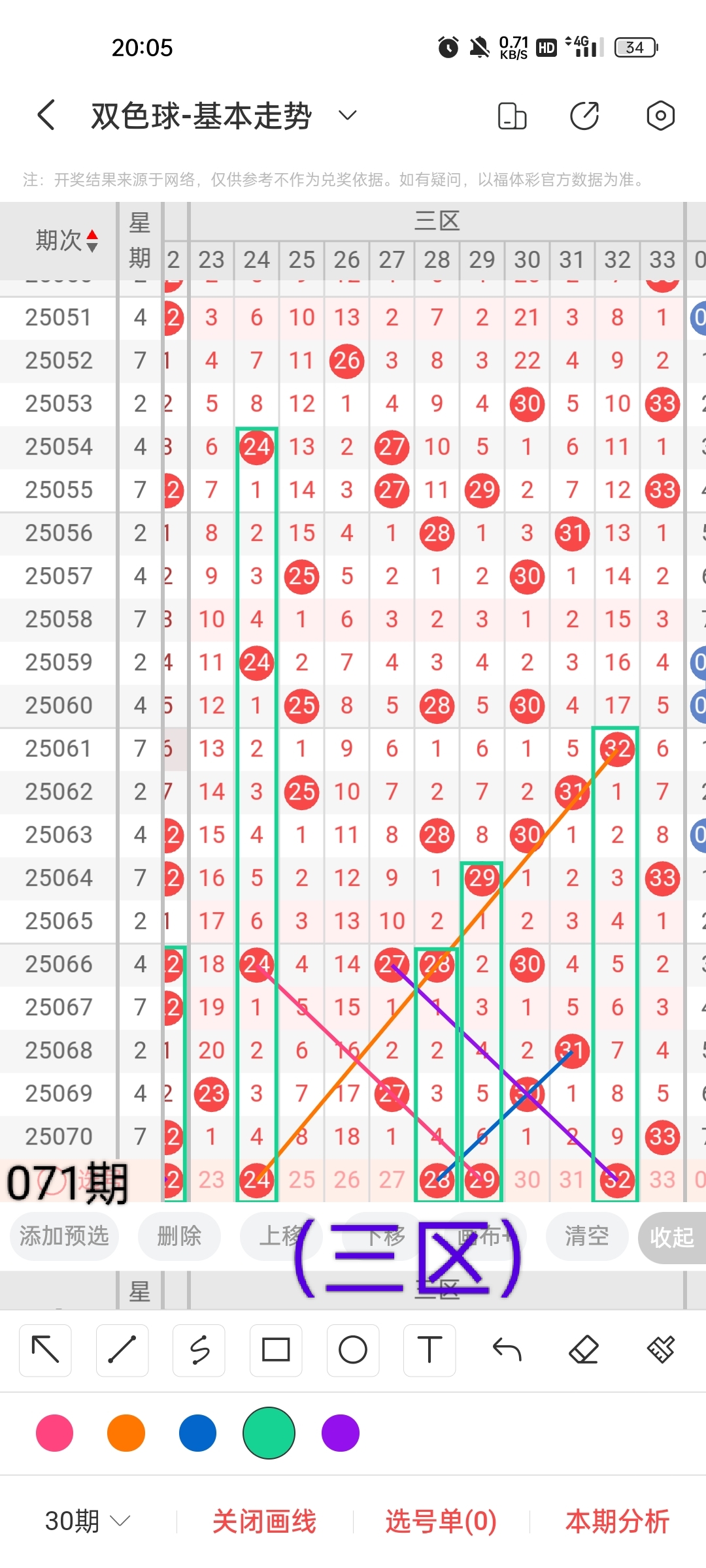 通过以上对上期的简单回顾,下面进入双色球第2025071期(下面简称本期)的选号分析: