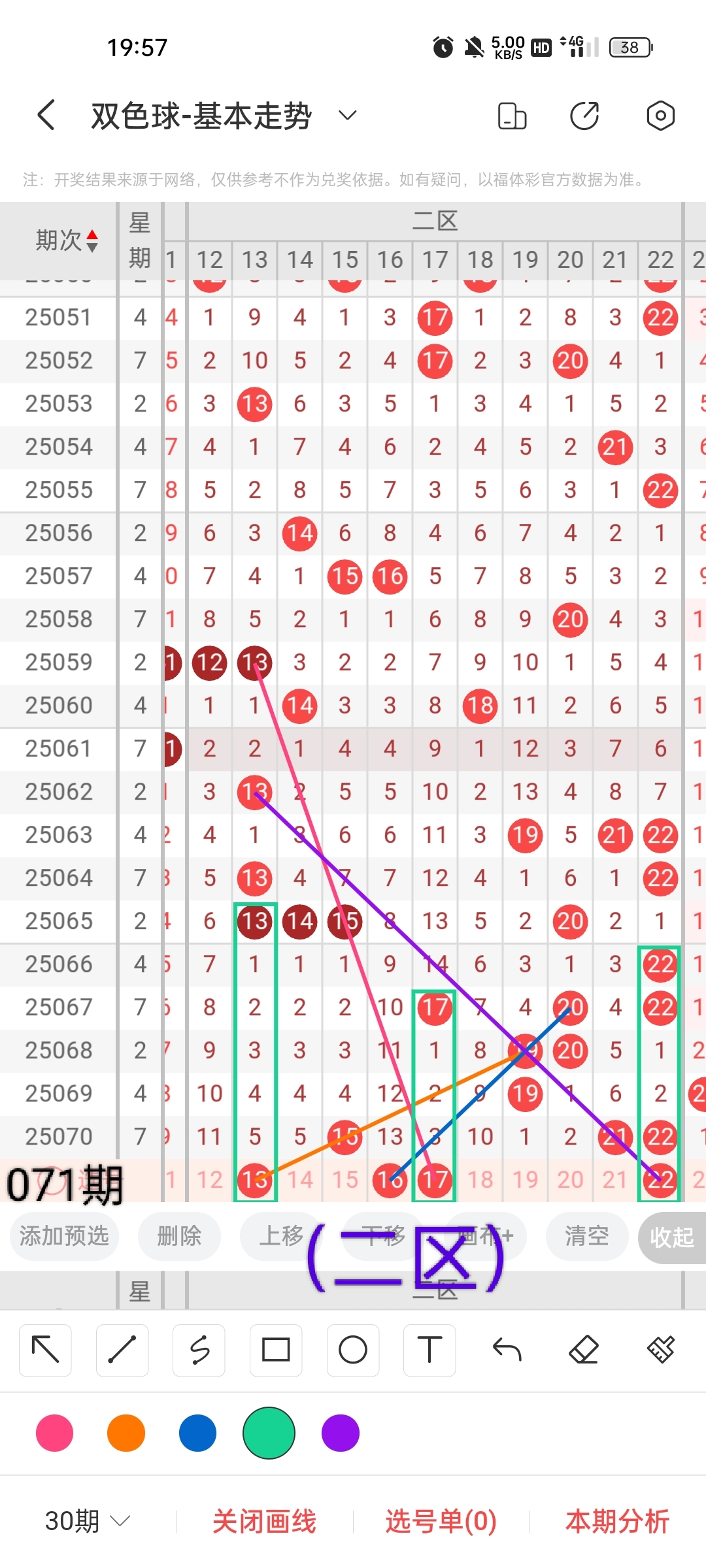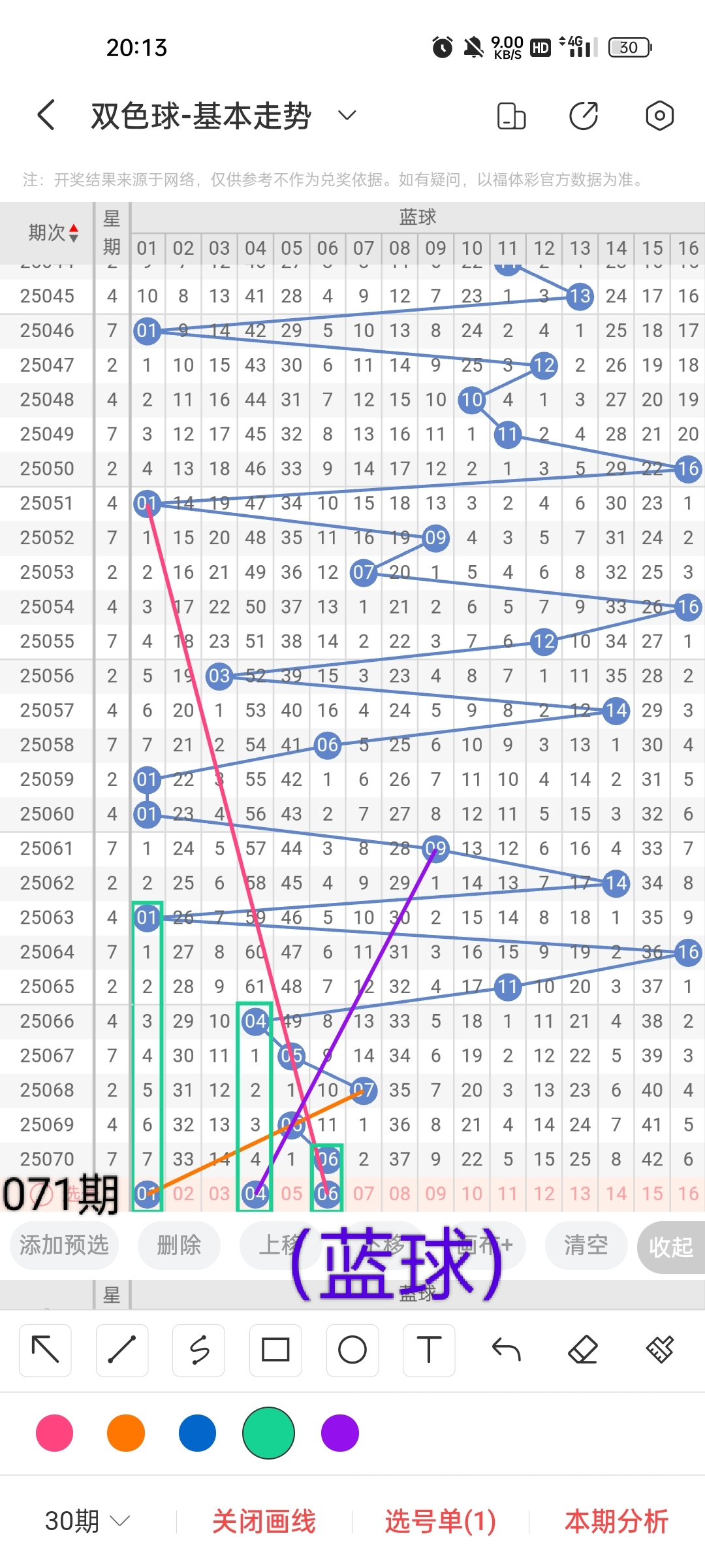 小梁根据图中画线思路,最后给大家汇总提供一下本期红球、蓝球数据,供大家参考: