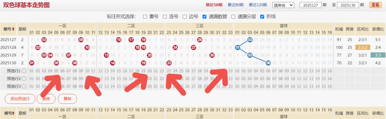 首先是本期双色球区间热度的考虑,一区在经历了上两期的火热之后,本期热度可能会有所下降,但仍不可忽视其出号能力,需适当关注一区中可能延续热度的个别号码。二区近期表现较为平稳,出号数量和号码分布都相对均匀,本期二区预计仍会有一定数量的号码开出,可重点留意二区中一些具有规律性走势的号码。而三区,由于前期较冷,本期0路号码热度回补的可能性较大,三区中0路的号码值得重点关注,同时也要兼顾三区其他路数的潜力号码,以全面把握三区可能出现的回补情况 。在奇偶比例方面,上期奇数占优,本期可适当考虑偶数号码的回补,平衡奇偶比例。推荐本期的区间比例为222/123。