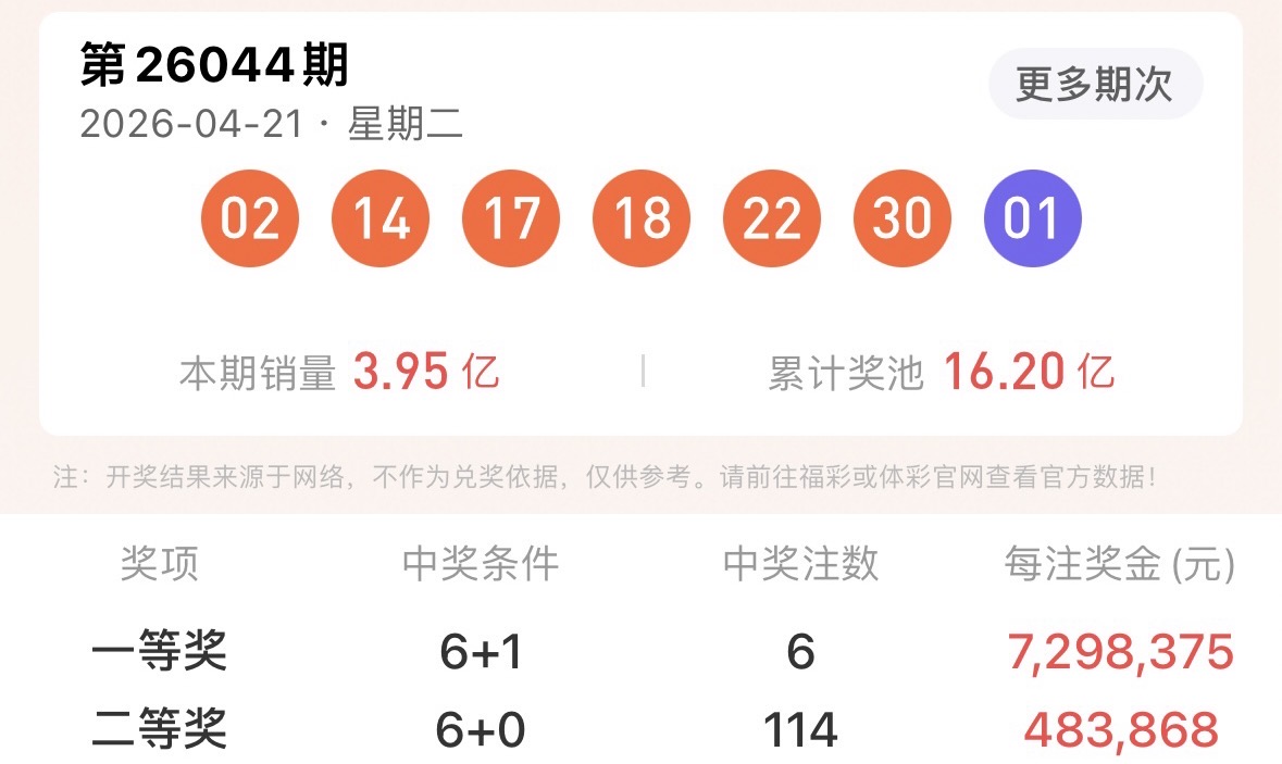 上期开出号码02、14、17、18、22、30 +01,全国共开出一等奖6注,单注奖金7,298,375元钱,二等奖共开出114注,每注奖金483,868元钱。