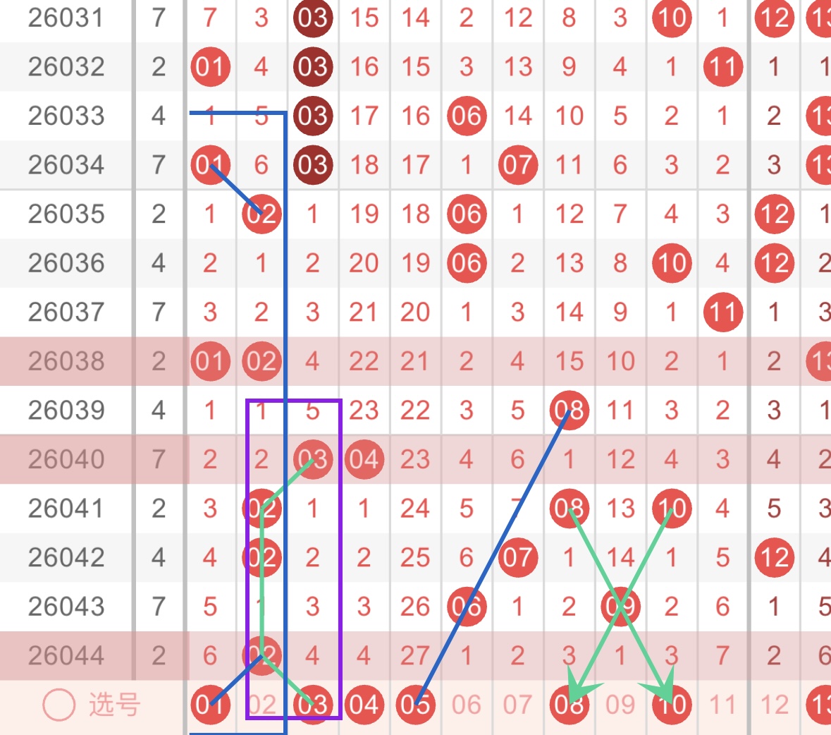 本期看好的蓝色球号码有01、02、03、05、08、10、11、12。