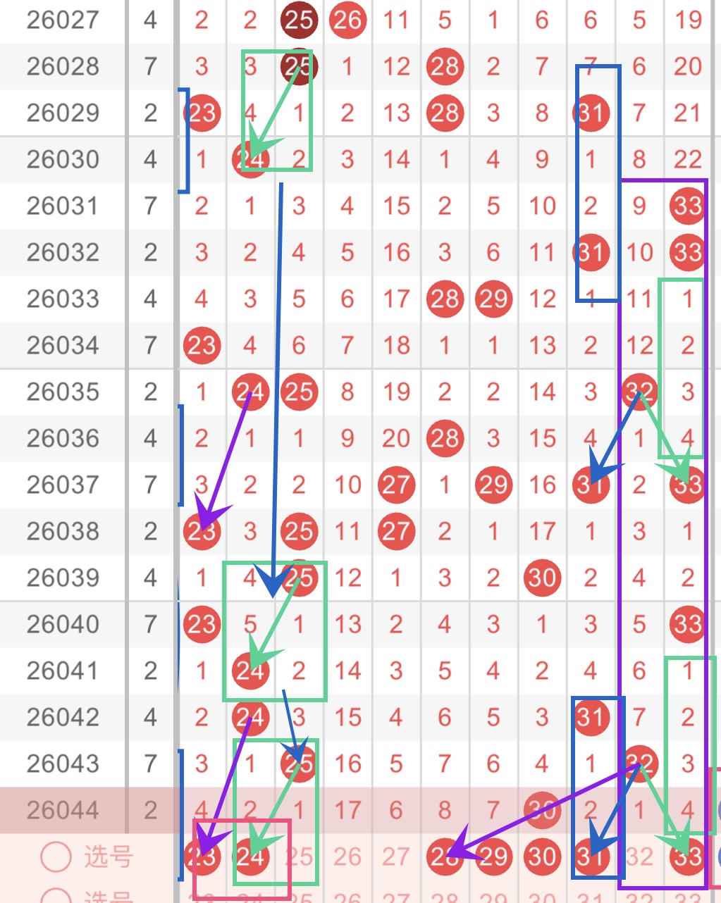 看好的号码有23、24、28、29、30、31、33。