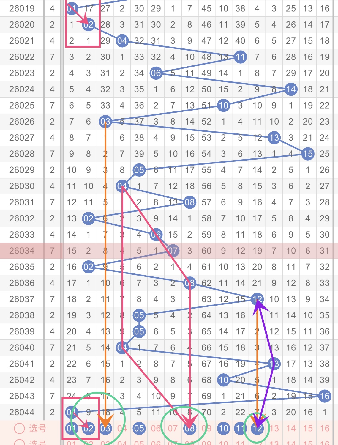 后区蓝色球上期开出了最小号码01,(其实一开始01是在我的计划里的,后来看到整振幅太大了,所以就放弃了,希望本期能回归常态)。