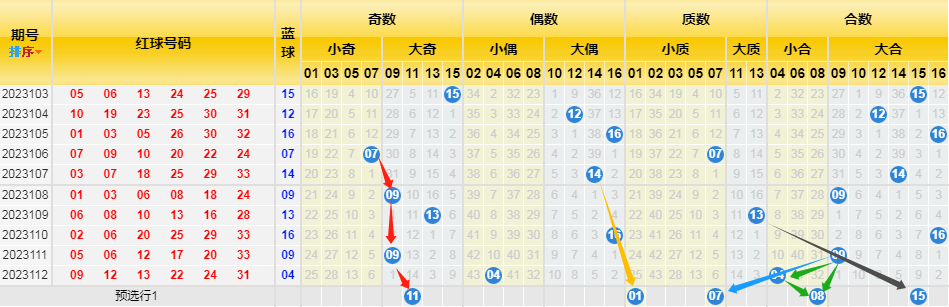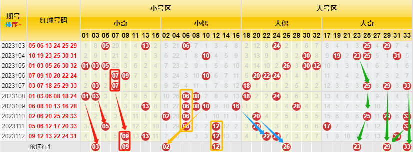 1、小大奇偶交叉图(小奇数红色箭标、小偶数黄色箭标、大偶数蓝色箭标、大奇数绿色箭标)