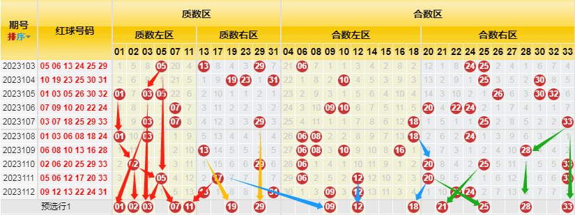 【数据参数】 根据前区质合小大属性,组合成上图质数区1、2、3、5、7、11、13、17、19、23、29、31和合数区4、6、8、9、10、12、14、15、16、18、20、21、22、24、25、26、27、28、30、32、33,质数区分为质数左区1、2、3、5、7、11和质数右区13、17、19、23、29、31;合数区分为合数左区4、6、8、9、10、12、14、15、16、18)和合数右区20、21、22、24、25、26、27、28、30、32、33。