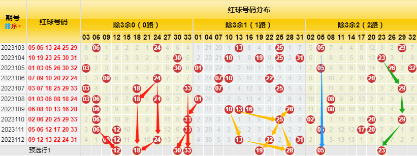 【数据参数】 根据前区除3余数,组合成上图分别为余0路(简称0路)3、6、9、12、15、18、21、24、27、30、33;余1路(简称1路)1、4、7、10、13、16、19、22、25、28、31; 余2路(简称2路)2、5、8、11、14、17、20、23、26、29、32。