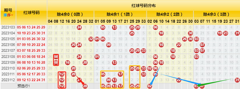 【数据参数】根据前区除4余数,组合成上图分别为余0路(简称0路)4、8、12、16、20、24、28、32);余1路(简称1路)1、5、9、13、17、21、25、29、33;余2路(简称2路)2、6、10、14、18、22、26、30;余3路(简称3路)3、7、11、15、19、23、27、31。