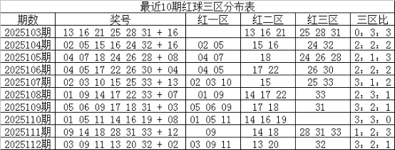 一区上期走热,开出3个红球,近10期开出21个红球,走势与理论相当,本期预计再次走温,出现1-2个奖号,参考号码03、05;二区上期走温,开出2个红球,近10期共开出21个红球,出号比例与理论持平,本期看好走热,开出3个红球,注意号码13、18、22;三区上期走温,开出1个红球,近10期共开出18个红球,出号与理论个数持平,本期预计继续走温,出现1-2个红球,看好号码27;