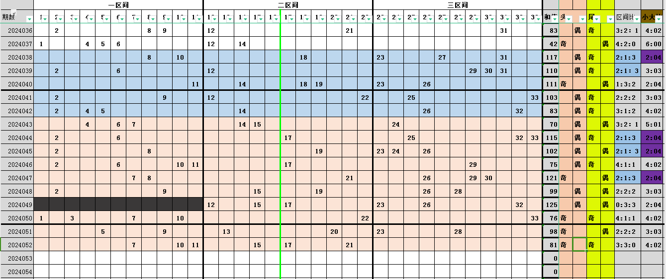 43期至52 期二区间总计出球个数17个 奇偶比13:4 44期45期46期47期50期二区间出球1个 ,43期48期51期二区间出球2个,49期52期二区间出球3个。二区间的奇偶的比例严重倾向于奇数,53期需注意偶数的回补1到2个偶数。