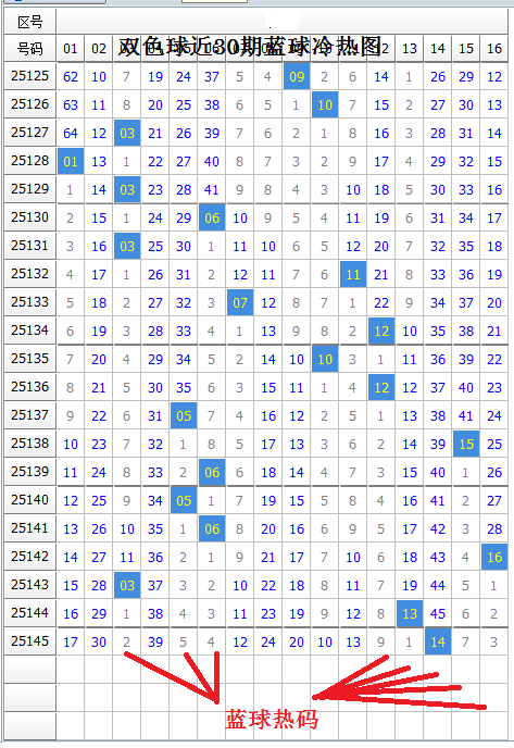 蓝球本期有热蓝8枚,冷蓝8枚,蓝球冷码数量一样。上期开出冷蓝,这是连续4期开出,由于近期蓝球冷热交替开出规律不明显,本期蓝球冷热难定。