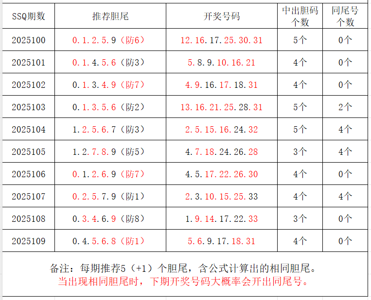 如图,每期推荐胆尾中出1-4个。上期推荐胆尾中出4尾4码!推荐胆尾是按照公式计算的顺序,不定位红球号码的顺序。本期推荐胆尾:3尾/5尾/7尾/1尾/0尾  。加推重点胆尾:***(会员专区可见)。推荐胆码号码:***(会员专区可见)。个人分析,仅供参考。