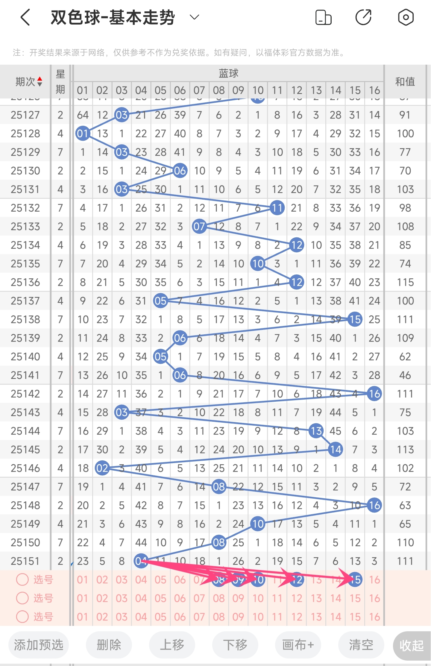 上期开出的是4,往前一期开出的是8。趋势往左偏移,偏移量为4,偏移量变大。通过分析目前蓝球的走势图,可以看到上期是4号球,最近冷号回补占多数,本期继续关注冷号。从偏移量来看,近期是大偏移量占的多,本期看好大偏移量的号码。最后再结合遗漏期数,以及冷热号,本期我们可以关注89101215等号码。综上所述本期推测可能开出89101215等号码。