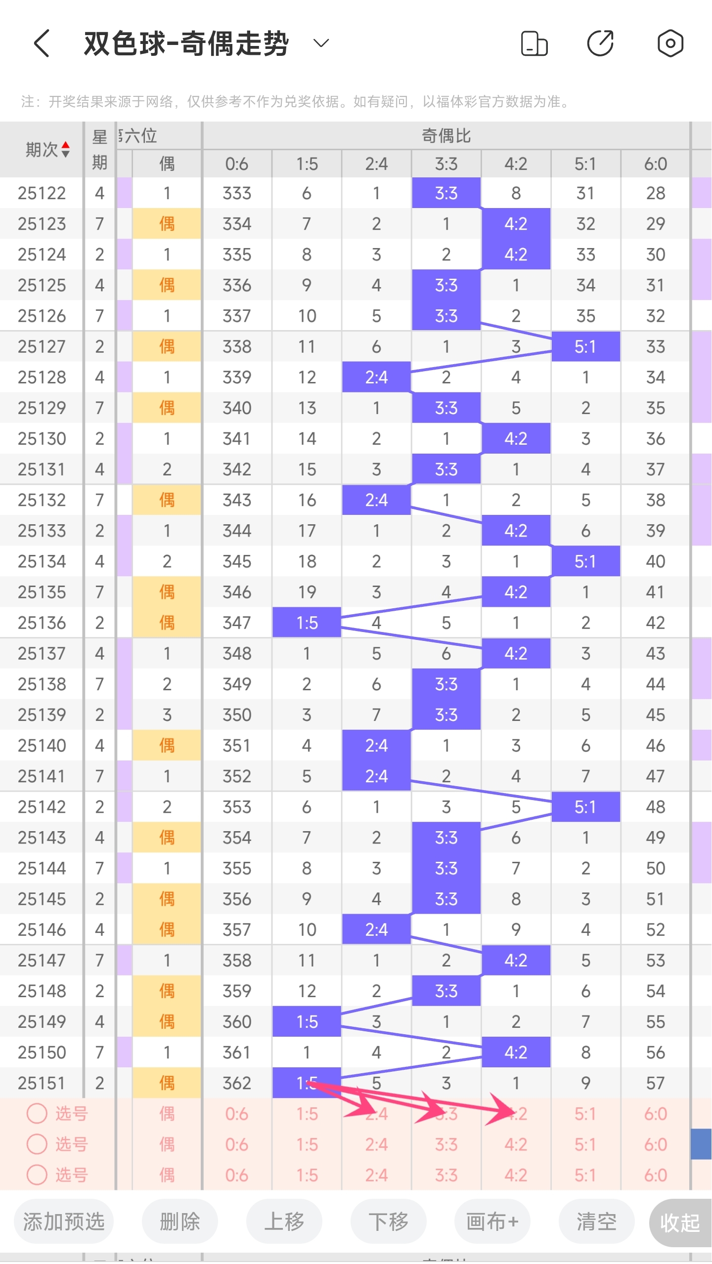 上期奇偶比为1:5,分别为偶奇偶偶偶偶。往前一期奇偶比为4:2。通过近30期内奇偶走势的数据分析,目前1:5奇偶比开出的概率是10%5:1奇偶比开出的概率是10%3:3奇偶比开出的概率是36.66%4:2奇偶比开出的概率是26.66%2:4奇偶比开出的概率是16.66%6:0奇偶比开出的概率是0%。与前一期相比,1:5概率变大,2:4概率变小。通过分析走势图,上期开了1:5奇偶比,本期看好4:2奇偶比。所以本期推测本期可能开4:2奇偶比,其次是3:3奇偶比或者2:4奇偶比,最后是1:55:1奇偶比。