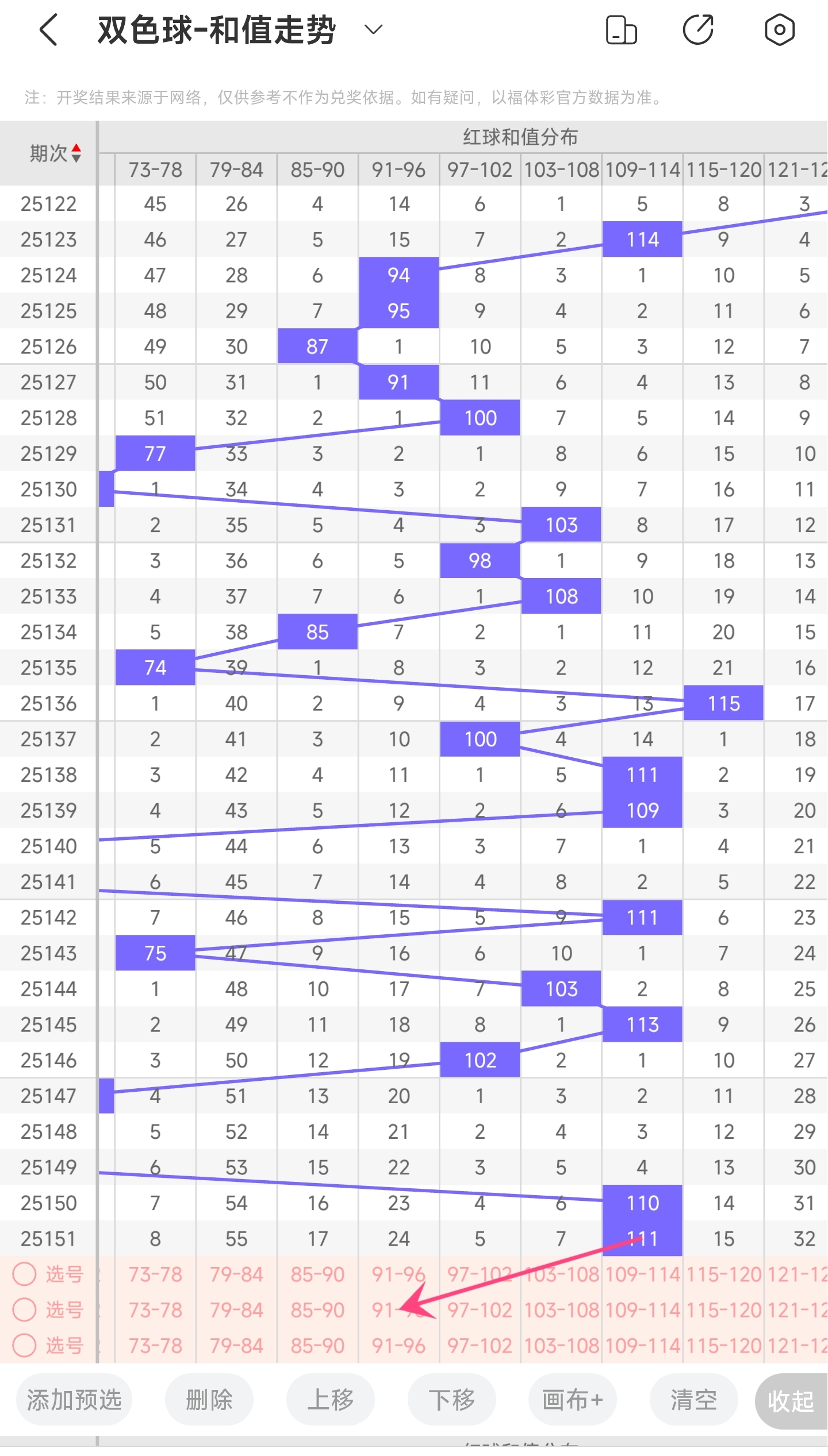 上期龙头为8,凤尾为30,跨度为22,往前一期跨度是25,偏移量为322跨度值是30期内开出的比较小的跨度值。上升的空间比较大,下降的空间比较小,本期看好跨度变大,所以推测本期跨度趋势是往右的,跨度变大,小概率往左,跨度变小。