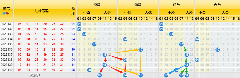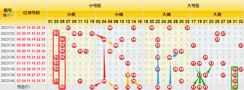 1、小大奇偶交叉图(小奇数红色箭标、小偶数黄色箭标、大偶数蓝色箭标、大奇数绿色箭标)