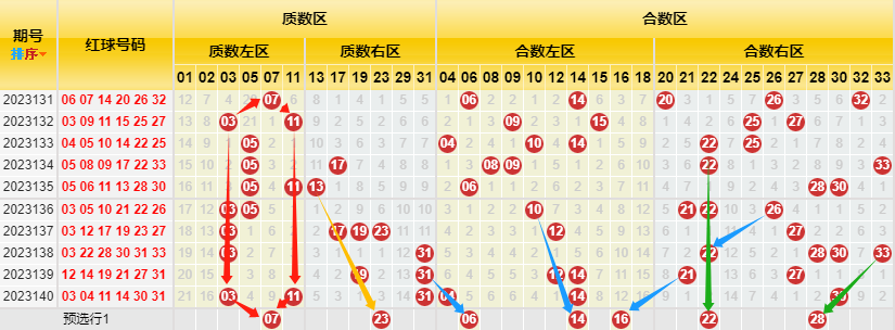 【数据参数】 根据前区质合小大属性,组合成上图质数区1、2、3、5、7、11、13、17、19、23、29、31和合数区4、6、8、9、10、12、14、15、16、18、20、21、22、24、25、26、27、28、30、32、33,质数区分为质数左区1、2、3、5、7、11和质数右区13、17、19、23、29、31;合数区分为合数左区4、6、8、9、10、12、14、15、16、18)和合数右区20、21、22、24、25、26、27、28、30、32、33。