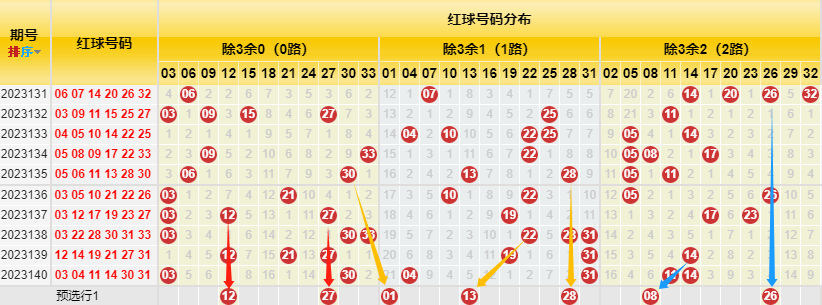 【数据参数】 根据前区除3余数,组合成上图分别为余0路(简称0路)3、6、9、12、15、18、21、24、27、30、33;余1路(简称1路)1、4、7、10、13、16、19、22、25、28、31; 余2路(简称2路)2、5、8、11、14、17、20、23、26、29、32。