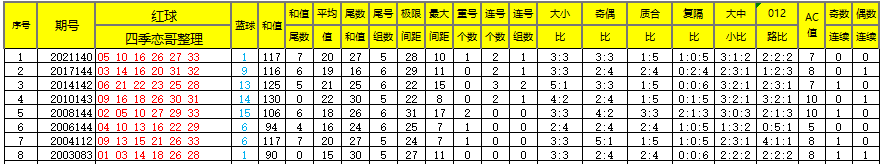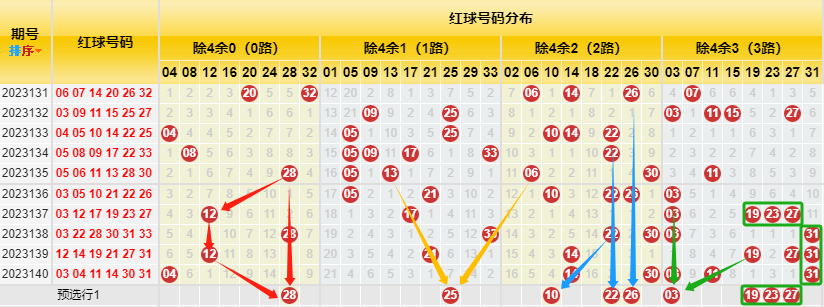 【数据参数】根据前区除4余数,组合成上图分别为余0路(简称0路)4、8、12、16、20、24、28、32);余1路(简称1路)1、5、9、13、17、21、25、29、33;余2路(简称2路)2、6、10、14、18、22、26、30;余3路(简称3路)3、7、11、15、19、23、27、31。