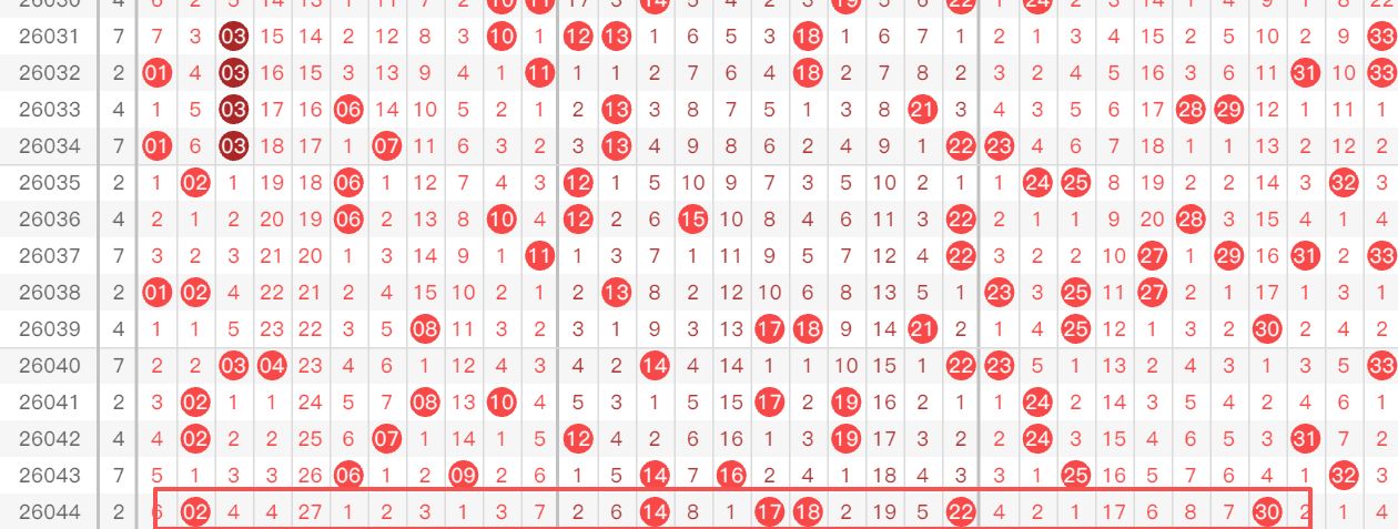 - 二区(12-22):上期狂开4枚(14、17、18、22),极度过热。本期二区势必降温,建议保留1-2枚重号或邻号