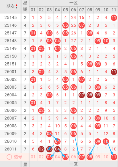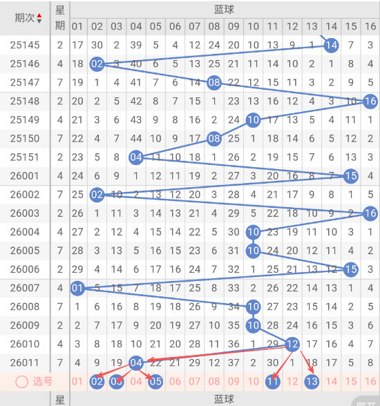 根据走势图近10期的走势看,蓝球在151期开出04蓝球之后,1大1小4大1小3大1小,再看下近10期的蓝球中冷码有回补的趋势,这种趋势规律本期判断极有可能开出大号,本期防蓝球08小号,蓝球本期重点关注02,03,05,11,13