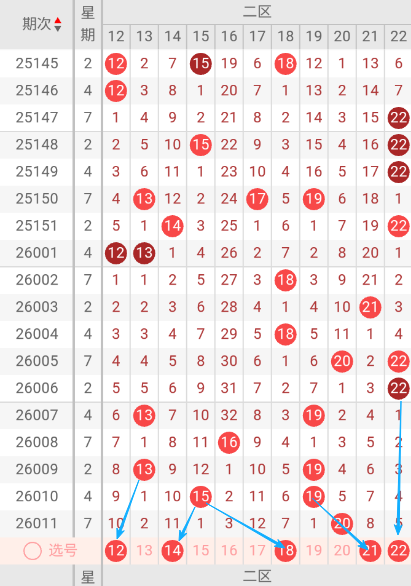 根据走势图可以看出当前区段,002期开出18一个号码球 ,003期开出21一个号码球 ,004期开出18一个号码球 ,005期开出20.22二个号码球 ,006期开出22一个号码球 ,007期开出13.19二个号码球 ,008期开出16一个号码球 ,009期开出13.19二个号码球 ,010期开出15.19二个号码球 ,011期开出20一个号码球 ,按照如此规律本期当前区可能开出2双。我们看下当前区上期没有开出重叠号,那么本期当前区要定重叠号的情况下可关注20号码球。再看下当前区上期开出20斜连号,当期选号得留意斜连21号码球。本区重点关注12.14.18.21.22