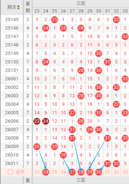 根据走势图可以看出当前区,002期开出30.32二个号码球 ,003期开出28.30二个号码球 ,004期开出32一个号码球 ,005期开出27.28.33三个号码球 ,006期开出23.24.28三个号码球 ,007期开出27.29.30三个号码球 ,008期开出27.31.33三个号码球 ,009期开出23.25二个号码球 ,010期开出26一个号码球 ,011期开出31.32二个号码球 ,按照如此规律判断本期当前区可能开出1双1单。我们看下当前区上期没有开出重叠号,那么本期当前区要定重叠号的情况下可关注31码球。再看下当前区上期没有开出斜连号,当期选号得留意30斜连号。本区重点关注24.27.28.29.30
