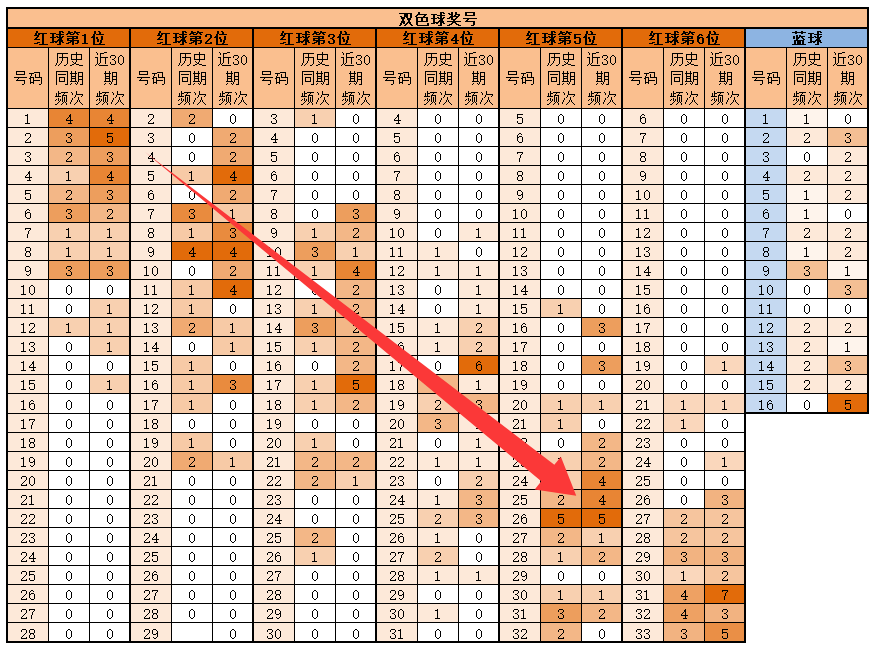 5位,基本在14-32之间,历史同期频次最多的为2630期,频次最多的为26,明显特征是偶数合数1优势;推荐重点242526272831