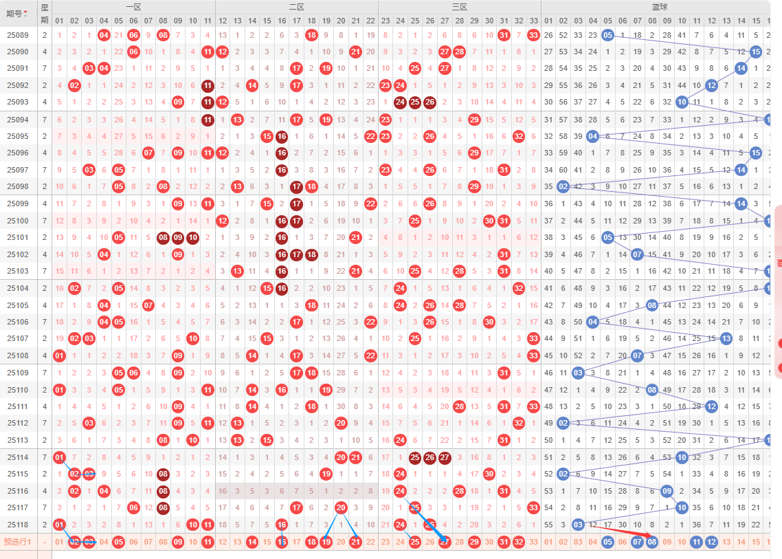 红球三区,上期开出2码,本期看好0-2码,从最近三区开号走势来看,最近的几期内凤尾分别在左路和右路开出的比较多,所以本期可以重点关注左路和右路的号码,但也要防一下中路回归。根据趋势本期看好的号码有2527293132等号,而2326283033中也可选1码防一下