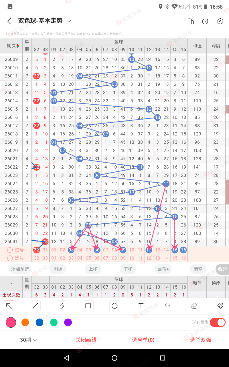 通过以上规律,近期表现为近10年同期,开球多的路数可以不考虑,(016-018-020-024-026-027-029期开球多的,路数错,)直到错为止因此031期不看2路蓝色,但本期防错