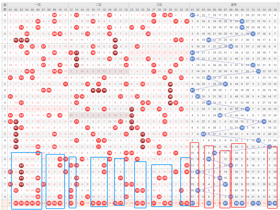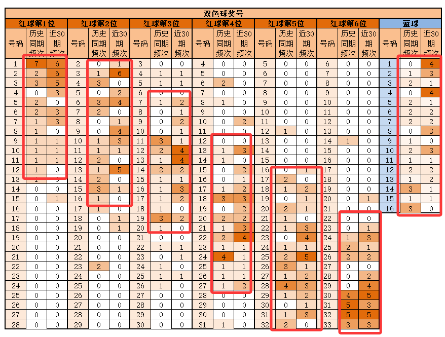 蓝球,历史同期频次最多的为14-16;近30频次最多的为1-4,明显特征是01路小优势;推荐重点1-2-4-6-8-10-12-13