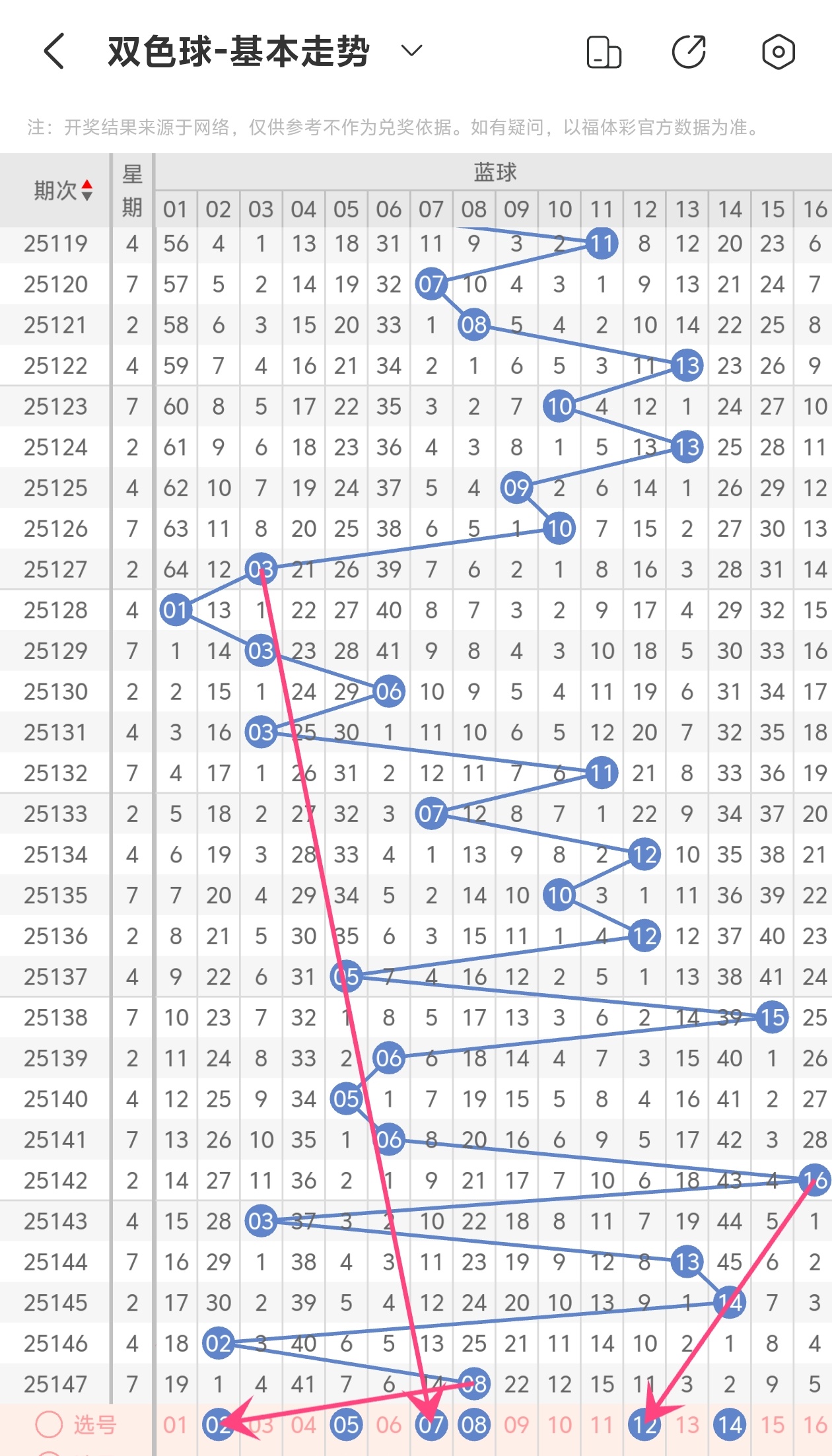 上期蓝球开出08,本期我们可以从上面走势图中看到选号的思路,02为隔期回补走势,07为斜连走势,08为重码走势,12为斜连走势,综合以上分析本期蓝球推荐02 07 08 12 14