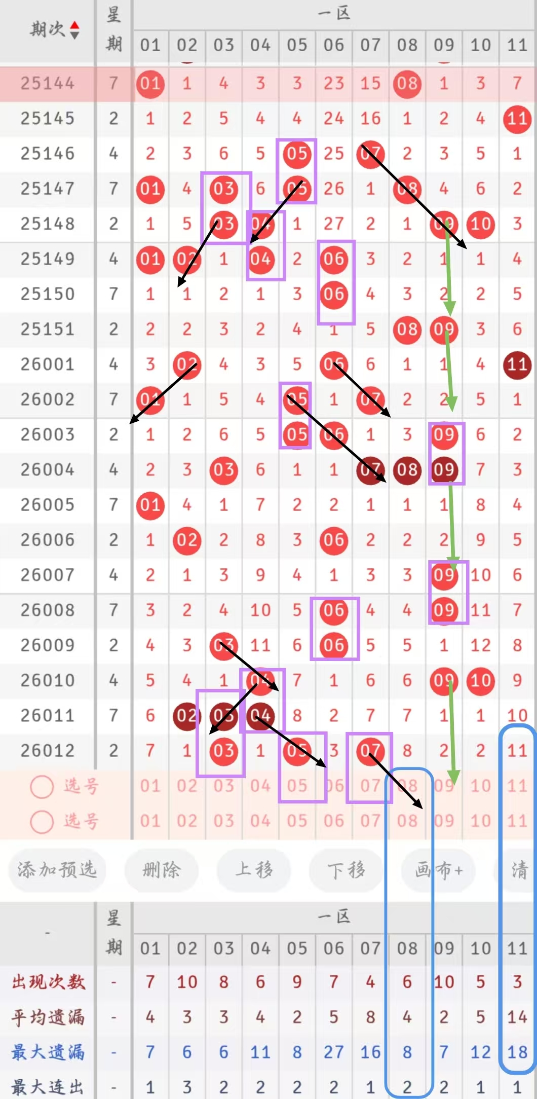 一区本期选号建议首先考虑重号05、07号,一区近20期一共开出了10次重号说明一区开出重号的概率较大,本期有可能会继续开出重号,且07号在近20期还没有开出过重号,可以考虑开出;其次可以考虑隔期号,09号在近20期内有多次是在遗漏2期开出,而本期距离上次开出刚好间隔了2期,说明本期开出09号的概率较大可以考虑开出。接着考虑邻号,在近20期开出了10次邻号说明一区开出邻号的概率较大,且上期开出的07号的邻号08号已经遗漏了8期达到了自身的最大遗漏期数,本期可以防邻号开出; 最后考虑冷号,11号已经遗漏了11期是目前一区遗漏期数最大的号,可以防冷号开出。