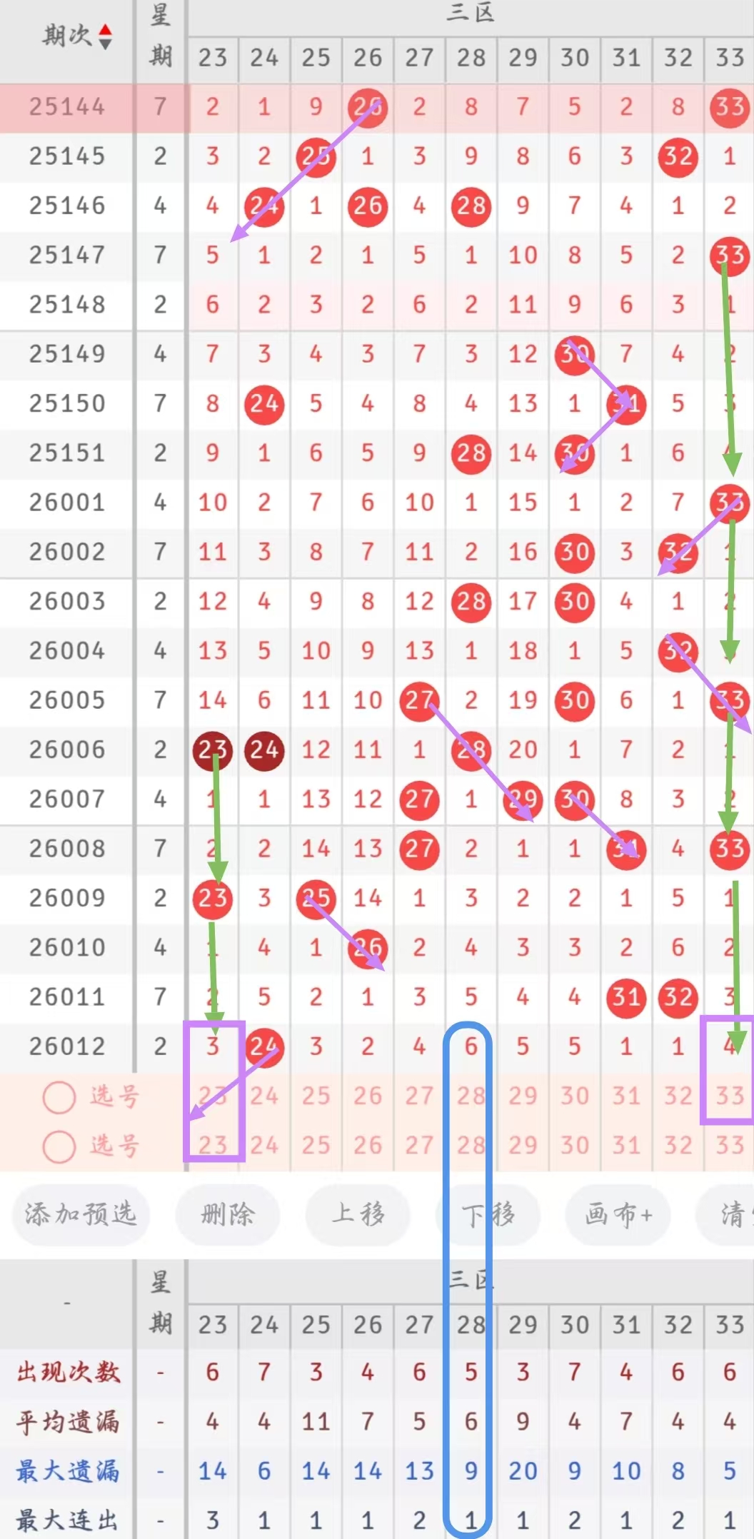 三区首先看好开出邻号23号,三区近20期出现10次邻号,说明三区开出邻号的概率很大,且23号上次开出时间隔2期本期距离上次开出间隔了3期,本期开出既可以作为上期开出的24号的邻号开出,也可以形成2-3形态;其次考虑隔期号33号,近20期内前几次开出33号时分别间隔了4期、3期、2期,而本期距离上次开出间隔了4期,本期开出将重复上次开出4-3-2时的形态。28号是三区目前遗漏最大的号可以考虑开出。