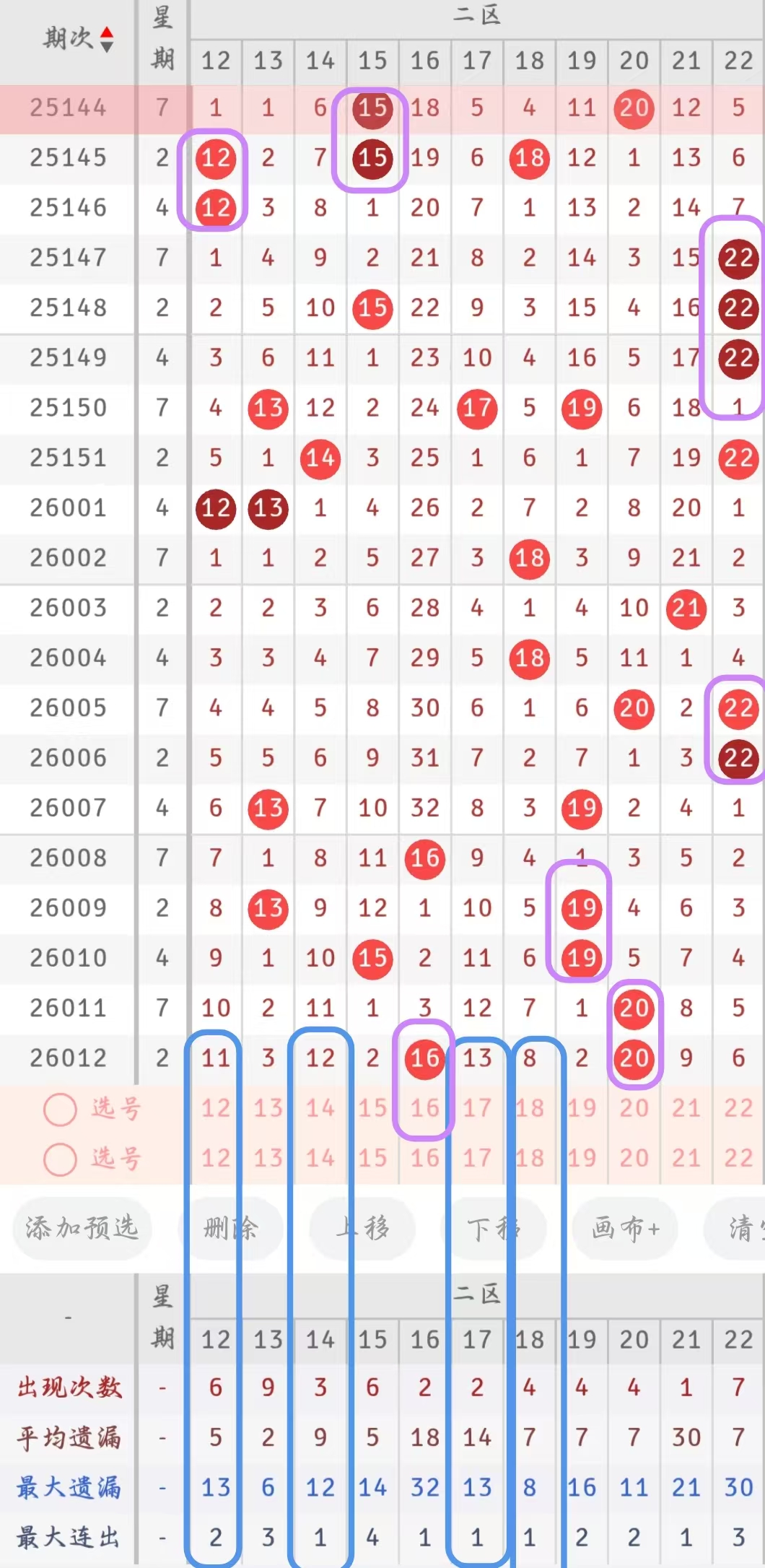 二区本期首先看好冷号,17号当前遗漏13期是二区遗漏期数最大的号而且达到自身最大遗漏期数,本期可以防冷号开出。14号遗漏了12期是二区第二冷的号且达到自身最大遗漏期数,也可以防冷号开出。12号遗漏了10期以上也可以防冷号开出。18号遗漏了8期达到自身最大遗漏期数也可以考虑开出.;其次看好重号,在近20期内开出重号7次最多重三期说明二区开出重号的概率较大,且16号在近20期内还没有重号过,可以防重号开出。还