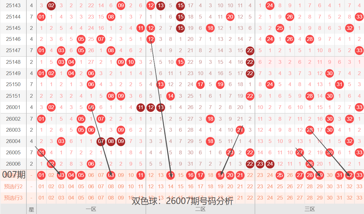 先介绍下上期开奖号码的基本情况,红球奇偶比:1:5,区间比:2:1:3,012路比:2:2:2,通过上期号码简单介绍,分享下26007期号码球个人认为的出号可能,供大家参考!